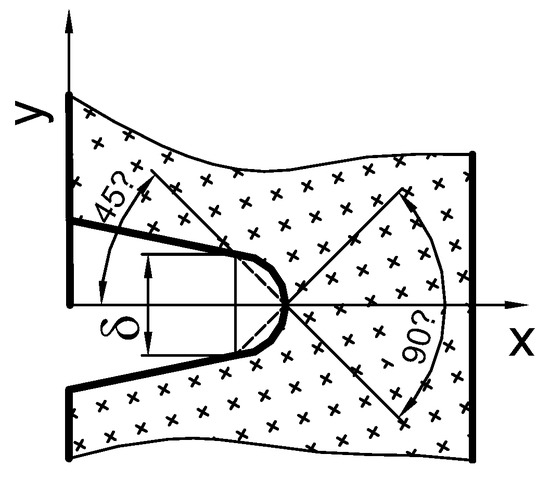 where δT is the crack tip opening displacement, J is the J-integral, σ0 is the yield point and m is the proportionality coefficient, depending on the parameters of the Ramberg–Osgood curve, yield point, Young’s modulus and the stress distribution near the crack tip determined according to the HRR solution—usually it is the value equated with the dn parameter, which is determined by knowing the parameters of the HRR field [15,16] and can also be determined using the computer program presented in [17].