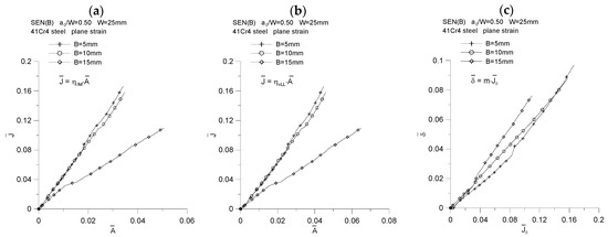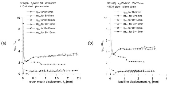 By plotting the changes of the normalized J-integral, denoted by , as a function of the normalized energy A, denoted by (Figure 17a,b), and then analyzing them, we can confidently say that the value of the coefficient η is equal to the tangent of the angel φ (the slope of the curve to the abscissae) [18]. It can be concluded that the value of the coefficient η depends on the thickness of the specimen; therefore, it is confirmed that the geometric constraints, both “in-plane” and “out-of-plane” constraints, affect its value. Figure 18 shows how the value of the coefficient η changes as a function of the increasing crack mouth displacement, δM, and the increasing load line displacement, vLL. The increase in load is accompanied by an attempt to obtain a fixed value, and for the thickness B = 15 mm, a jump in the value of the parameter η is observed, which is related to the step increase in the crack length. The analysis of Figure 18 shows that, for the case where the energy A is estimated based on the P = f(δM) diagram (Figure 18a), the value of the coefficient η is equal to 3.44, 3.29 and 1.70, for thickness B equal to 5, 10 and 15 mm, respectively. Thus, it is observed that the greater the thickness, the smaller the value of the η coefficient. The same effect is shown in Figure 18b. If the energy A is determined based on the P = f(vLL) diagram, the value of the coefficient η is equal to 4.72, 4.42 and 2.23, respectively, for the thickness B equal to 5, 10 and 15 mm.