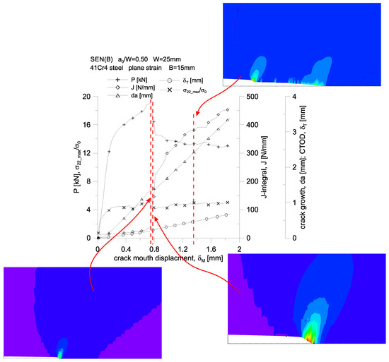 Changes of: the force, P, loading the specimen, the value of the J-integral, the crack length increment, da, the crack tip opening displacement, δT, and the maximum stresses opening the crack surfaces, σ22_max/σ0, as a function of the crack mouth displacement, δM, together with the distribution of effective stresses in close proximity to the crack tip. 41Cr4 steel specimen with a thickness of B = 15 mm.