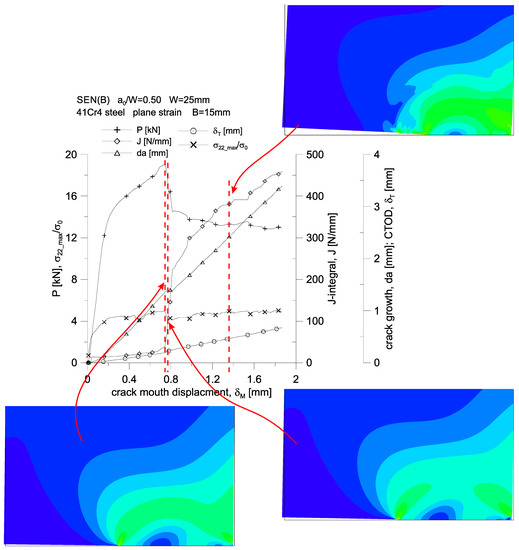 The second one corresponds to the hypothetical moment of the crack growth, at which, according to the J-R curve of the standard [1,2], crack growth begins—the value of the J-integral is about 136 N/mm.