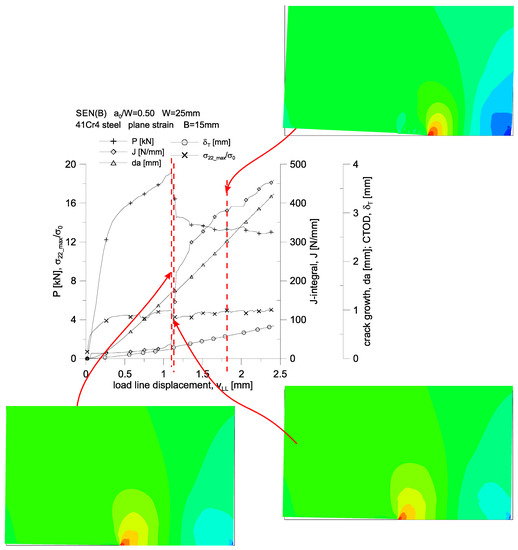 A slightly different nature of the changes can be noticed in the case of the analysis of the obtained results for the SEN(B) geometry with a thickness of B = 10 mm. While in the case of geometry with a thickness of B = 5 mm, a significant step increase in the crack length was observed, amounting to over 1 mm, for geometry with a thickness of B = 10 mm, we speak of a step increase of 0.5 mm. This is reflected in Figure 15b,e. During the presented load range, almost linear increases in the crack tip opening displacement, δT, and the increase in the fracture length, da, both as a function of the crack mouth displacement, δM, and the load line displacement, vLL, are observed. When the displacement of the load line displacement reaches the value vLL = 1 mm, the crack length increases rapidly—the J-integral value increases almost twice. It can be noted that the value of the maximum stresses opening the crack surfaces is almost constant and amounts to approximately (4.5–5.0)·σ0. This means that in the case of the thickness B = 10 mm, the increase in the length of the crack was not so significant as to affect the value of this measure of geometric constraints. It has been shown in [13] that the increase in the crack length is usually accompanied by a decrease in the maximum values of stresses opening the crack surfaces. In the case of the analyzed geometry and the material used, the increase in the fracture length by over 2.5 mm (i.e., by 10% in relation to the width of the specimen, W) significantly affects the level of maximum stresses opening the crack surfaces. This conclusion is also confirmed by the evaluation of the cracking process described in the previous paragraph for a specimen with a thickness of B = 5 mm (Figure 15a,d).