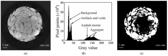 In recent years, CT scanning technology has been increasingly used for the microstructural characterization of asphalt [12], bituminous mortar [13], and asphalt mixture. Within research on asphalt-mixture CT image processing, the focus has mainly been placed on the methods emloyed to separate aggregate, mortar, and void within the image [14,15]. Currently, commonly used methods include the artificial threshold method [16,17,18], fuzzy C-means algorithm [19,20], Gaussian mixture model [21], and Otsu algorithm [22,23,24,25]. The most widely used is the Otsu algorithm. When Otsu is applied to images with artifacts, however, the segmentation effect is less than satisfactory. To solve this problem, Liu put forward the ring division method [26], which achieved higher segmentation accuracy. Nevertheless, it failed to determine accurately the size of the test piece and its position in the image. Additionally, the method was restricted to reducing the impact of artifacts on image segmentation when faced with the artifacts distributed along the radial non-linear section of the test piece, meaning it was unable completely to address the problem of artifacts.
