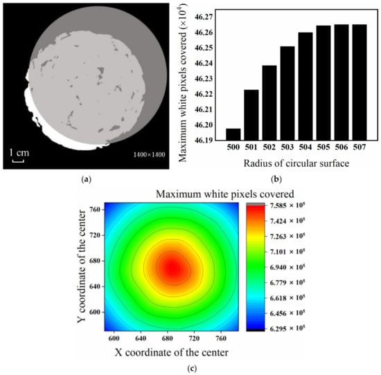 Diagram of center and radius’s determination. (a) Circular surface covering white pixels; (b) determined radius of the test piece; (c) determined center of the test piece.