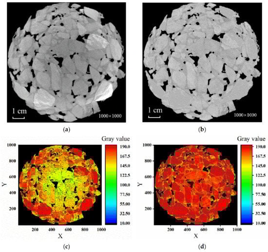 The effect of the 7 × 7 filter is shown in Figure 8, revealing that the peak of the representative aggregate in the gray histogram narrowed but shifted upward after noise reduction, indicating that the aggregate gray value tended to be uniform and that the effect of noise reduction was evident.