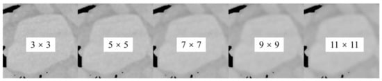 The existence of noise makes the threshold segmentation program prone to errors in the recognition of aggregate edge, and can cause adverse effects on the calculation of threshold, as a result of which the threshold segmentation program shows sensitivity to noise. It was thus necessary to filter the image for the purpose of noise reduction. In this study, the adaptive low-pass Wiener filter [29] was applied to filter the grayscale images, with 3 × 3, 5 × 5, 7 × 7, 9 × 9, 11 × 11 selected respectively as filter windows, to estimate the mean and standard deviation of local images, shown in Figure 7.