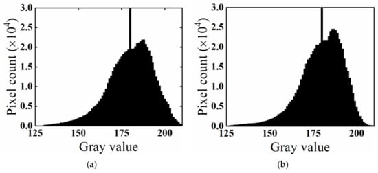 (3) Based on the average gray value of the pixels in each approximate ring, 180 was taken as the target gray value. When the average was no greater than 180, the gray value of the pixels on the i-th approximate ring was processed as follows, and the pixels in the whole image whose gray value exceeded 180 were made equal to 180: