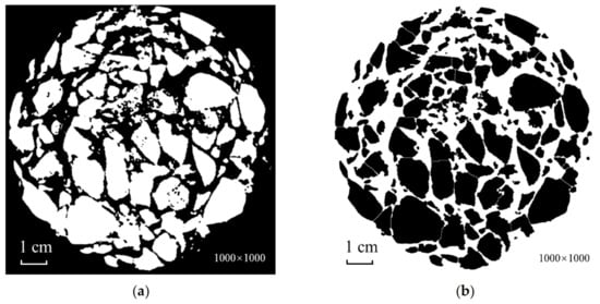 Depending on the grayscale characteristics of the image, the Otsu algorithm divides the image into two parts: background and foreground, with the variance taken as a measurement of the uniformity of grayscale distribution. Thus, the greater the variance between the background and foreground, the more significant are the differences between the two parts of the image. In this situation, the threshold calculated by the Otsu algorithm is considered best when the variance between the two parts is the largest. Therefore, Otsu thresholding based on the whole image was selected to perform binarization. At this stage, the gray value of voids and artifacts in the image was returned to zero, and the image contained as few as three parts, i.e., black background, asphalt mortar, and aggregate. The aim of binarization is to separate the aggregate. Therefore, in this study, Otsu was applied to calculate the double threshold. The smaller threshold was the boundary between the background and the asphalt mortar, while the larger threshold was the boundary between asphalt mortar and aggregate. The higher threshold was used for segmentation, with the gray value of mortar restored to zero. The result is shown in Figure 9.