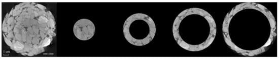 (1) Zero processing of the grayscale of voids. Since the extracted object used in this study was aggregated, it was necessary for mortar and voids to be removed as background. However, mortar cannot be removed due to the presence of artifacts, resulting in the grayscale of mortar and making the aggregates overlap each other. In order to prevent this from impacting the calculation of the statistical distribution of grayscale along the radius, multi-threshold segmentation and image subtraction [22] were first performed to remove the voids, as shown in Figure 4.