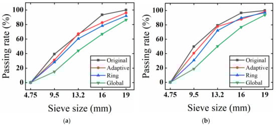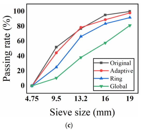 Comparison of three test pieces’ gradation curves. Adaptive: image processing based on the adaptive image-processing method. Ring: image processing based on ring division. Global: image processing based on global segmentation. (a) SMA grading comparison; (b) OGFC grading comparison; (c) AC grading comparison.