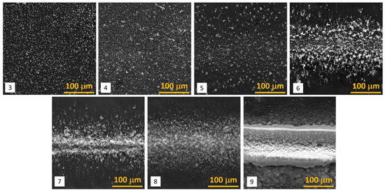 Low-magnification SEM images of the surface of the impactor plates after the particle collection. Numbers at the bottom left corner of each image indicate the impactor stage identifier as shown in Table 2. Starting material: TLS Technik H13 powder; laser operation power: 80–85% (the image set is representative for both starting materials and all laser powers tested).