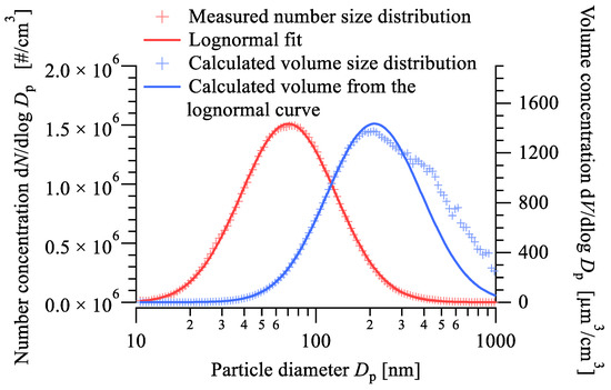 Measured size distribution of the released particles by the SMPS just after laser cladding with the TLS H13 powder. The background concentration in the room was three orders of magnitude lower than the concentration of the new particles. The measured size distribution can be modeled by a lognormal distribution. The blue markers and the blue line show the calculated volume size distributions. The line is calculated from the lognormal fit, while the markers are calculated from the measured data.