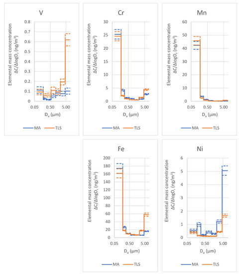 Size distribution of particulate V, Cr, Mn, Fe, and Ni concentrations for samples collected during laser cladding operation using two different H13 feedstock powders (MetcoAdd—MA; TLS Technik—TLS). Uncertainties (±σ) are indicated using dashed lines.
