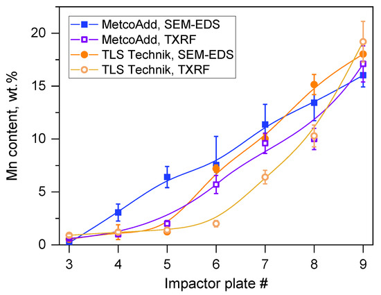 Manganese weight percentages as measured using SEM-EDS and TXRF for large surface areas of the impacted particle deposits. Sampling on the Si substrates for the TXRF analysis was followed by separate sampling on adhesive carbon substrates for the SEM-EDS analysis. The error bars indicate the standard deviation of 4 measurements.
