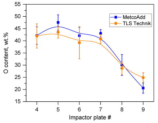 The particles trapped on the impactor surface are oxidized to various extents, as shown in Figure 6. The oxygen content of the deposits increases as the ratio of the residues of the original particles increases, and the small-sized aggregates decrease in the fractions collected (from high to low impactor stage numbers, in accordance with Figure 1). However, it must be noted that the oxygen detected with the SEM-EDS system may partly be bound to the carbon serving as the aerosol collector. Since the uncovered surface ratio of the impactor plates increases as larger and larger particles are collected (with decreasing amounts), the contribution of the oxygen present on the carbon surface may lead to an apparent increase in the O weight percentage. Even though this factor alone cannot be responsible for the trend shown in Figure 6 (the SEM-EDS analysis of the blank carbon surface shows much less oxygen; see Appendix E, Figure A6), a similar difference can be seen between the analysis results obtained for large and small surface areas. If small aggregates are analyzed locally with no uncovered C impactor surface, the result is usually much closer to 20 wt.%, i.e., to the value obtained for layers formed from aggregated particles. If a local analysis is carried out for spherical particles, the oxygen content is often relatively large, especially when the morphological features of the original powder can no longer be identified on the particles, indicating that they may have undergone in-depth oxidation during the laser treatment. In this respect, a clear difference can be seen between the residual particles that either do or do not exhibit the surface trenches resembling the original ones (those showing the surface trenches contain less oxygen than those whose surface is featureless).