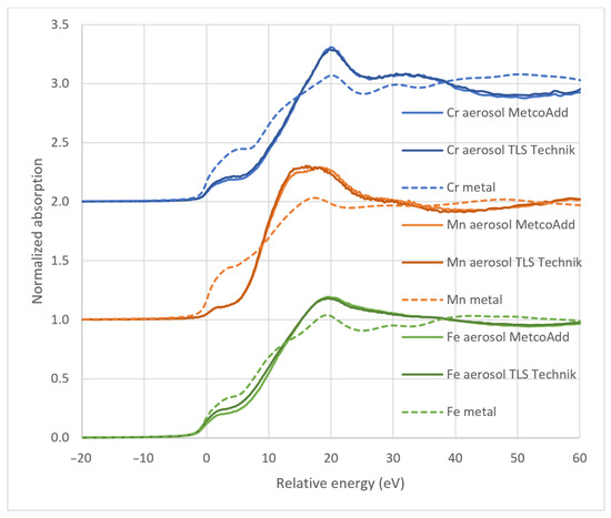 In general, the XANES spectra of the total aerosol generated from both types of H13 feedstock powders look similar for all selected metals. Since the edge features (at around 0 eV relative energy) are smaller with respect to the metallic spectra for Cr, Mn, and Fe, the presence of oxidized metals is expected to be significant in the aerosol samples (see Figure 7). For Mn, only a small step is visible at the absorption edge energy of the Mn metal (0 eV relative), indicating that Mn is highly oxidized. For Cr, the presence of Cr6+ could be excluded due to the absence of the characteristic pre-edge peak.