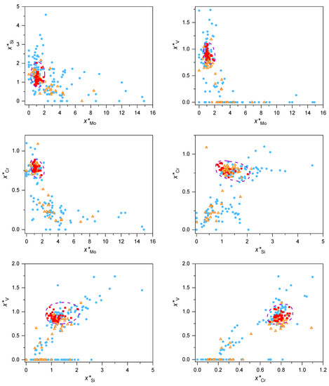 In order to determine the migration correspondence of each pair of studied elements, Spearman correlation coefficients were calculated, which is an excellent measure of a nonlinear monotonic relationship. Particles showing no sign of transformation and identified as original powder (i.e., falling in the labelled areas in Figure 9) were excluded, as well as particles lacking one of the two elements studied here. The Cr and V contents of the particle shows an interesting correlation with the Mo and Si contents. The high Cr and V losses can be associated with the large Mo content of the particles (R(Cr,Mo) = –0.67 and R(V,Mo) = –0.51), while the relatively high Si content is desired for V and Cr retention (R(V,Si) = 0.91 and R(Cr,Si) = 0.66). Although the concentration of all these elements is less than 5 wt.% in the Fe-rich matrix, it is interesting to note that both Cr and V are silicide-forming metals with several stable silicide phases, but they exhibit a nearly complete immiscibility with Mo. Since V and Cr are relatively volatile as compared to Si and Mo, it is not surprising that they selectively evaporated from the particles annealed by the cladding environment. The bottom right graph of Figure 9 indicates that these two elements migrate in a correlated manner (R(V,Cr) = 0.88), and their loss occurs simultaneously.