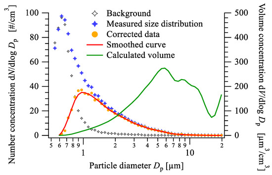 The numerical concentration and number size distribution of the aerosols were monitored via SMPS and APS during each cascade impactor sampling phase (with the SMPS+C Model 5416 device from Grimm Aerosoltechnik Ltd., Ainring, Germany and the APS Model 3321 device from TSI Incorporated, St. Paul, MN, USA, respectively). While the APS measures the aerodynamic diameter, like the cascade impactor, the SMPS determines the electrical mobility diameter of the particles. The two types of equivalent diameters can be different from each other based on the shape and density of the particles [34]. The two instruments together cover wide size ranges with only a small region of overlap, with 10 to 1094 nm and 0.5 to 20 µm for SMPS and APS, respectively.