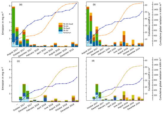 Monthly emissions of terbutryn and transformation products from a white and a red paint film during semi-field experiments that were started in July 2017 (experiment A) and September 2017 (experiment B). The columns represent the substances that were detected in runoff samples per month. The blue curves show the cumulated volume of runoff samples per surface area for each experiment. The orange curves show the cumulative global radiation during the experiment. (a) Experiment A, white paint; (b) experiment A, red paint; (c) experiment B, white paint; (d) experiment B, red paint.