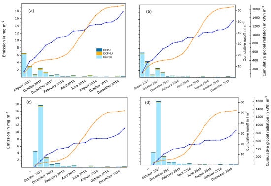 Monthly emissions of diuron and transformation products from a white and a red paint film during semi-field experiments that were started in July 2017 (experiment A) and September 2017 (experiment B). The columns represent the substances that were detected in runoff samples per month. The blue curves show the cumulated volume of runoff samples per surface area for each experiment. The orange curves show the cumulative global radiation during the experiment. (a) Experiment A, white paint; (b) experiment A, red paint; (c) experiment B, white paint; (d) experiment B, red paint.