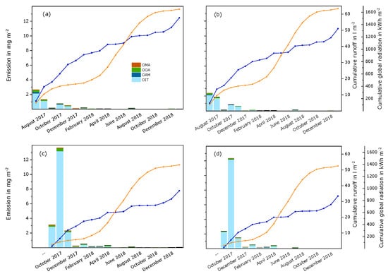 Monthly emissions of OIT and transformation products from a white and a red paint film during semi-field experiments that were started in July 2017 (experiment A) and September 2017 (experiment B). The columns represent the substances that were detected in runoff samples per month. The blue curves show the cumulated volume of runoff samples per surface area for each experiment. The orange curves show the cumulative global radiation during the experiment. (a) Experiment A, white paint; (b) experiment A, red paint; (c) experiment B, white paint; (d) experiment B, red paint.
