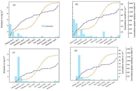 Monthly emissions of carbendazim from a white and a red paint film during semi-field experiments that were started in July 2017 (experiment A) and September 2017 (experiment B). The columns represent carbendazim that was detected in runoff samples per month. The blue curves show the cumulated volume of runoff samples per surface area for each experiment. The orange curves show the cumulative global radiation during the experiment. (a) Experiment A, white paint; (b) experiment A, red paint; (c) experiment B, white paint; (d) experiment B, red paint.