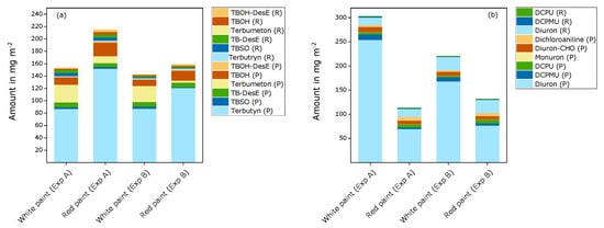 Mass balance of terbutryn and transformation products (a) and diuron and transformation products (b) in white and red test panels at the end of the semi-field experiment. The amounts of the transformation products are related to the initial amounts of the active substances, i.e., the initial amounts of transformed active substances were calculated and presented in the graphs. Data for the test panels (P): mean value of six sections; data for the runoff (R): sum of 83 (experiment A) and 69 (experiment B) runoff samples. Calculated original amounts for active substances: 230 mg m−2 (experiment A) and 218 mg m−2 (experiment B). Dichloroaniline, diuron-CHO, and monuron were only analyzed in the last 12 runoff samples.