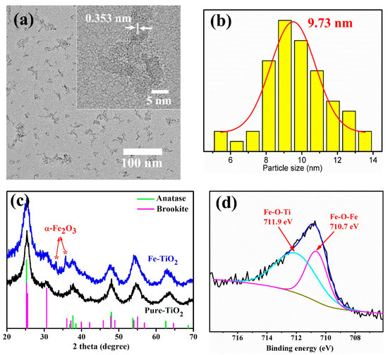 The morphology and structure of Fe-TiO2 nanoparticles were characterized. As shown in Figure 1a,b, Fe-TiO2 nanoparticles with an average size of ca. 10 nm were in the shape of short nanorods. In Figure 1c, XRD showed that Fe-TiO2 and Pure-TiO2 nanoparticles consisted of anatase (PDF#71-1167) as a major crystal phase and brookite (PDF#76-1937) as a secondary crystal phase. The interplanar spacing of 0.353 nm (Figure 1a inset) corresponded to the (101) crystal plane of anatase, which was consistent with XRD results. It is worth noting that two diffraction peaks appeared in 33.2° and 35.6°, which were ascribed to (104) and (110) crystal planes of hematite (α-Fe2O3, PDF#33-0664), respectively. XPS fine spectrum of Fe 2p3/2 (Figure 1d) indicated that Fe element existed in the forms of Fe-O-Ti and Fe-O-Fe structure. The XRD and XPS results demonstrated that Fe element successfully doped into the lattice of TiO2 and generated α-Fe2O3 phase in Fe-TiO2 nanoparticles.
