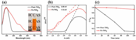 (a) UV-vis DRS spectra, (b) corresponding (Ahv)1/2~hv curves and (c) photocatalysis curves of pure TiO2 and Fe-TiO2 nanoparticles.