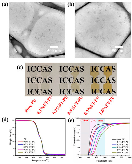 TEM images of ultrathin section of (a) 0.5%FT-PU and (b) 1.0%FT-PU films. (c) Photograph of neat PU and FT-PU films. (d) TGA curves of PU nanocomposite films. (e) UV-vis transmission spectra of neat PU and PU-FT nanocomposites.