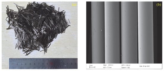 According to the Specifications for Airport Cement Concrete Pavement Design (MH/T 5004–2010) and concrete strength design requirements, the mixing ratio of ordinary performance concrete (OPC) is shown in Table 1. In the label “B-J”, “B” represents the BFAPC specimen, and “J” represents the fiber volume content. The selected materials were ordinary Portland cement (P·O 42.5, density 3.10 g/cm3), fly ash (F-type I low-calcium, density 2.30 g/cm3), granulated blast furnace slag powder (S95-grade, density 2.90 g/cm3), polycarboxylic acid high-performance water reducing agent (CNMB Zhongyan Technology Co., Ltd., Changsha, China), coarse aggregate (two continuous gradings: 4.75–16 and 16–30.5 mm), fine aggregate (machine-made sand, fineness modulus 3.2), and basalt fiber (Shanghai Chenqi Chemical Technology Co., Ltd., Shanghai, China). Figure 1 shows the macroscopic and microscopic morphology of BF, with a length of 12 mm. Table 2 displays its physical–mechanical indices.