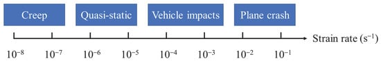 In the test, the specimen was subjected to three-point bending loading using an MTS-810 testing machine (MTS Systems Corporation, Eden Prairie, MN, USA). The span S was 300 mm, and the loading mode was controlled by displacement. In order to compare the fracture damage of concrete beams at different strain rates, Figure 2 displays the range of strain rates under different working conditions [27,28]. The loading rates were 0.009 mm/min, 0.09 mm/min, 0.9 mm/min, 9 mm/min, and 90 mm/min, and the corresponding strain rates were 10−6 s−1, 10−5 s−1, 10−4 s−1, 10−3 s−1, and 10−2 s−1, respectively, which were used to simulate quasi-static loading, vehicle load, and aircraft impact load (see Figure 2). A pre-load of 0.1 kN was applied to the specimen before loading, in order to obtain more stable experimental data. The tests were repeated three times at each rate, in order to ensure the accuracy of the test.