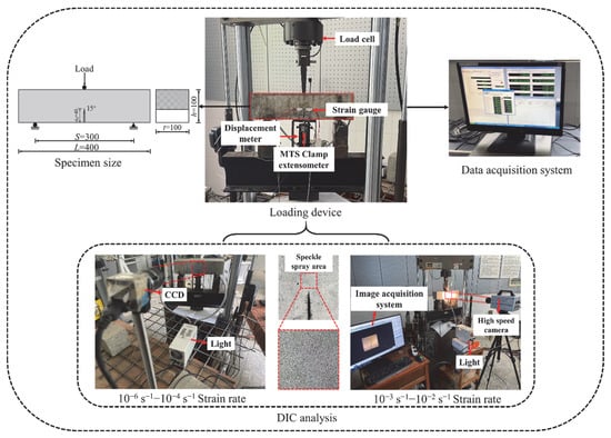 A pair of resistive strain gauges with a distance of 10 mm was arranged symmetrically at 10 mm from the crack tip of the specimen, in order to determine the crack initiation load Pini during loading. The specimens were smoothed with a grinding machine before the test, ensuring that the strain gauge and the surface of the specimen fit flat. The crack mouth opening displacement (CMOD) of the specimen was measured using an MTS self-contained clip-on extensometer, with measuring range of 5 mm. The mid-span displacement was measured using a displacement sensor with a range of 10 mm. The above data were collected synchronously by a dynamic strain tester (DH 15202). DIC was used to monitor crack growth during loading. Before the test, a layer of white matte paint was sprayed on the crack propagation area of the specimen, following which a black speckle was sprayed. We adjusted the lens position, exposure, and focal length to obtain clear images. The image acquisition frequency was adjusted, according to the different loading rates. The NCORR image analysis software was used to calculate the displacement and strain of the specimen surface. The whole test device is shown in Figure 3.