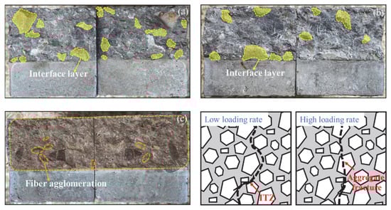 The fracture cross-sections of BFAPC at different strain rates are shown in Figure 4. At strain rates of 10−6 s−1 and 10−4 s−1, the crack propagation path of the specimen presented a certain deflection, and the fracture surface was rough with some partially intact aggregates. At strain rates of 10−2 s−1, the fracture surface of the specimen gradually became flat, and more and more coarse aggregates failed along the fracture surface. This is due to the existence of a large number of micro-cracks at the interface between the coarse aggregate and the mortar, which is the weakest area in the matrix [20]. At lower strain rates, the crack propagated from the interfacial transition zone (ITZ) of the aggregate–mortar. With an increase in the strain rate, the crack did not have enough time to pass through the ITZ. This caused it to pass directly through the coarse aggregate, making the fracture surface smoother. The same result was found in reference [20,29]. The strength of the aggregate is usually higher than the ITZ, which is one of the reasons for the increased fracture strength at high strain rates [23,30].
