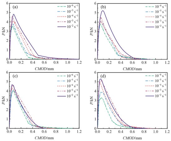 The P–CMOD curves under different loading rates: (a) OPC; (b) B-0.2; (c) B-0.4; and (d) B-0.6.