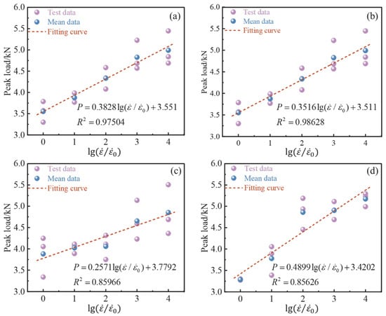 The relationship between the peak load and strain rate: (a) OPC; (b) B-0.2; (c) B-0.4; and (d) B-0.6.