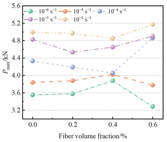 The variation curves of peak load with different fiber content are shown in Figure 7. It can be seen that BF had a certain effect on the peak load. Compared with OPC, the peak load of BFAPC with 0.4% fiber content was the highest at strain rates of 10−6 s−1 and 10−5 s−1, which increased by 3.77% and 9.23%, respectively. However, the peak load of concrete at 0.6% fiber content decreased by 7.51% and 2.55%, respectively, indicating that this level of content has a negative effect at low strain rates. This may be due to the fiber more easily agglomerating at high dosages, which increases the weak interface within the matrix. In addition, the peak loads of BFAPC at strain rates of 10−4 s−1, 10−3 s−1, and 10−2 s−1 were reduced under 0.2% and 0.4% fiber content; however, the peak loads were increased by 12.14%, 3.72%, and 4.46% for 0.6% fiber content, respectively. It can be concluded that, under low strain rate, 0.4% fiber content can improve the fracture load of concrete, to a certain extent. Although the concrete with 0.6% fiber content had a negative effect on the peak fracture load at low strain rates, it presented a certain strengthening effect at high strain rates.