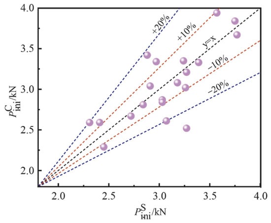 Figure 8 contrasts the Pini measured by the strain gauge method and the test curve method, in order to verify the validity of the two methods. The black dashed line in the figure indicates y = x. The two red dashed lines indicate that the ratio of − to is ±10%. The two blue dashed lines indicate that the ratio of to is ±20%. It can be seen from the figure that 70% of the initial cracking load measured by both methods fell within the ±10% range, and 95% of the data points fell within the ±20% range. Overall, the results indicate that the difference between the cracking load measured by the strain gauge method and the test curve method was not significant. Therefore, it is appropriate to adopt the load corresponding to CMOD = 0.02 mm as the initial cracking load. By using the two methods for determining the initial cracking load, the test results can be cross-validated.