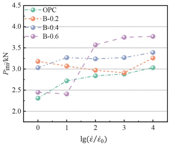 Figure 9 shows the relationship between the strain rate and initial cracking load. From the figure, it can be seen that there was a certain strain rate effect of the initial cracking load, but there was no obvious pattern between it and the strain rate. Compared with the initial cracking load when the strain rate was 10−6 s−1, the initial cracking load of each group at 10−2 s−1 was increased (by 31.2%, 2.5%, 11.9%, and 53.9%, respectively). It can be seen that the strain rate had the most significant effect on the initial cracking load of the OPC and B-0.6 groups. It is worth noting that, at 0.6% fiber content, the initial cracking load of concrete changed abruptly during the transition from 10−5 s−1 to 10−4 s−1 strain rate (increased by 48.13%), demonstrating that this content had the highest initial cracking load at a higher strain rate, while it did not have an effective role at low strain rate. The sensitivity of the initial cracking load to the loading rate was higher for this content.