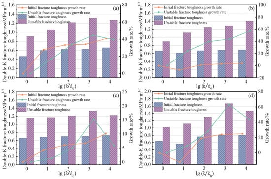 The relationship between the double K fracture toughness and strain rate: (a) OPC; (b) B-0.2; (c) B-0.4; and (d) B-0.6.