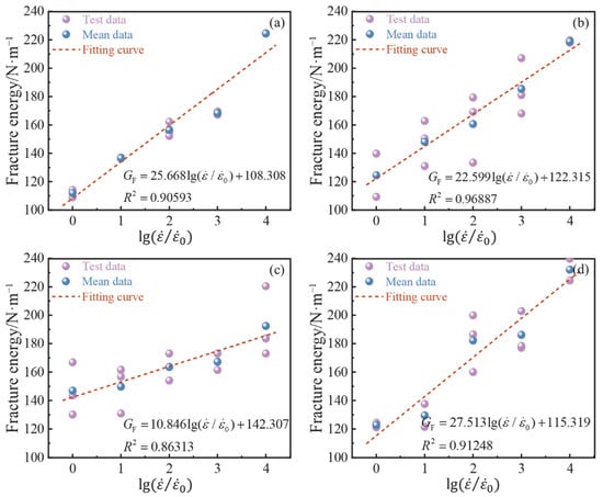 The relationship between the fracture energy and strain rate: (a) OPC; (b) B-0.2; (c) B-0.4; and (d) B-0.6.