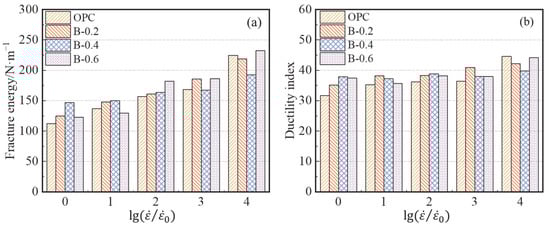 As shown in Figure 12a, the addition of BF has a significant effect on the fracture energy of concrete. Compared with the fracture energy of OPC, the failure of BFAPC requires more energy. At strain rates of 10−6 s−1 and 10−5 s−1, the highest fracture energy of B-0.4 group was 146.90 and 149.82 N·m−1, respectively, whereas the highest fracture energy of B-0.6 group was 182.17, 186.12, and 232.14 N·m−1 at strain rates of 10–4 s−1, 10–3 s−1, and 10−2 s−1, respectively. The reason for this is that the fracture damage of concrete requires additional energy to overcome the adhesive force between the fiber and matrix, as well as the energy consumed when the BF is pulled out. Thus, the toughness of BFAPC is improved; this higher toughness indicates that the specimen has a higher resistance to failure, which is also reflected in the relatively flat curve of the tail section of the P–CMOD curve shown in Section 3.2. Li et al. [10] found that a higher fiber volume content led to a greater number of fibers involved in crack resistance in the fracture process zone (FPZ) and, consequently, a greater amount of energy required to damage the concrete. From the above conclusions, the energy required for the fracture of fiber-reinforced concrete is also related to the strain rate the concrete is subjected to. As shown in Figure 12b, the ductility of concrete was only slightly improved or even decreased with the addition of BF. This phenomenon was also observed during the experiment. It can be concluded that, although the toughness of concrete will be improved by adding BF, the ductility may be weakened at high strain rates.