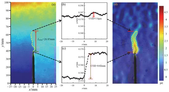 The BFAPC with 0.6% fiber content at strain rate of 10−6 s−1 at peak load: (a) COD contour; (b) COD pattern at y = 40 mm; (c) COD pattern at y = 66.85 mm; and (d) strain contour.