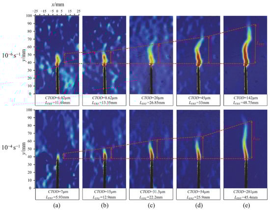 The strain contours of 0.6% BFAPC at strain rate of 10−6 s−1 and 10−4 s−1: (a) Pre-60%Pmax; (b) pre-80%Pmax; (c) Pmax; (d) post-80%Pmax; and (e) post-20%Pmax.