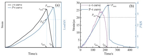 where tini is the time corresponding to the maximum strain measured by the strain gauge at the crack tip and tp is the time corresponding to the time when the specimen reaches the maximum load Pmax. The crack initiation time tini and the time to peak load tp can be determined from the strain and load time variation curves. The schematic is shown in Figure 15a. Figure 15b depicts the relevant experimental results obtained in this paper. The figure makes it simple to determine tini and tp.
