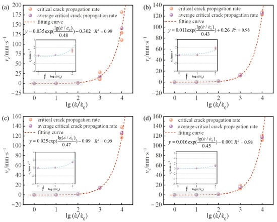 Critical crack propagation velocities at various loading rates: (a) OPC; (b) B-0.2; (c) B-0.4; and (d) B-0.6.