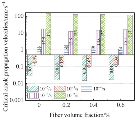 Figure 17 depicts the impact of various BF addition on the critical fracture growth rate of concrete. Ngo [50] and Li [52] demonstrated that reinforcements significantly affected on the propagation of crack in ultra-high-performance fiber-reinforced concrete (UHPFRC) based on the crack growth rate. Compared with OPC, the crack extension rate was reduced by 51.6% and 41.3% for the B-0.4 group at strain rates of 10−6 s−1 and 10−5 s−1, respectively, this indicates that this dose had the best effect, in terms of suppressing cracks in static expansion; the crack extension rate was reduced by 28% for the B-0.2 group at strain rates of 10−3 s−1; meanwhile, the fiber content of 0.6% played a better role in suppressing crack expansion of concrete (reduced by 16.18% and 17.02%, respectively) at a strain rate of 10−4 s−1 and 10−2 s−1. No obvious pattern was determined between the fiber admixture and the critical crack expansion rate at the same strain rate. In conclusion, the incorporation of BF inhibited the crack expansion of concrete and reduced the critical crack expansion rate.