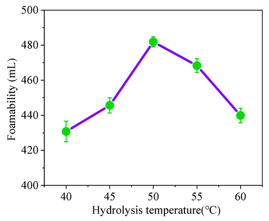 The effect of hydrolysis temperature on foaming ability: To check the effect of temperature for foaming ability, the conditions were set to a pH value of 10.0, hydrolysis time of 3 h, and hydrolysis temperature values of 40, 50, and 60 °C.