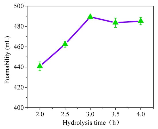 In order to determine whether the effect of hydrolysis time on foaming ability is significant, we set the conditions for the single-factor test at a pH value of 10.0, hydrolysis temperature of 50 °C, and hydrolysis times of 2, 3 and 4 h.