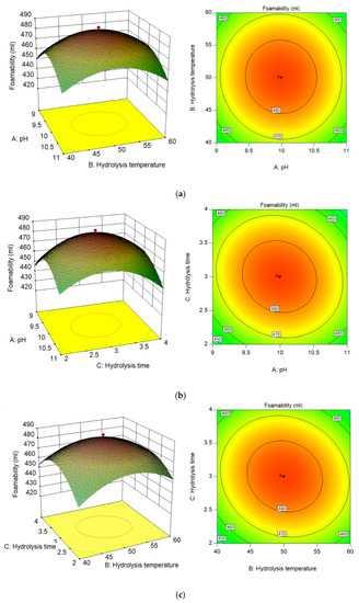 The interaction between the independent variables X2 and X3 is obvious (Figure 4). When the reaction temperature is in a relatively soft environment, the independent variable X3changes between 2.5 h and 3.5 h, and the value of the dependent variable is the highest. When the reaction solution is hot and alkaline, it will not only reduce the high-temperature resistance of the cell wall, but will also accelerate the hydrolysis of organic matter, resulting in the rapid rupture of the cell wall [14]. The higher the degree of cell wall rupture, the more protein molecules release, so a large number of protein molecules will produce more bubbles. It should be noted that the higher independent variables, X1 and X3, will lead to protein molecule failure. With the bond breaking within and between protein molecules, a large number of hydrophobic amino acids will appear in the solution. This reaction will improve the softness and hydrophobicity of the protein molecules [37]. However, when the independent variable X2 is greater than 55 °C, no matter what the reaction temperature is, the dependent variable will decrease significantly. When the reaction environment becomes bad, it will not only reduce the value of the dependent variable, but will also produce an unpleasant smell of ammonia because the protein is over-hydrolyzed.