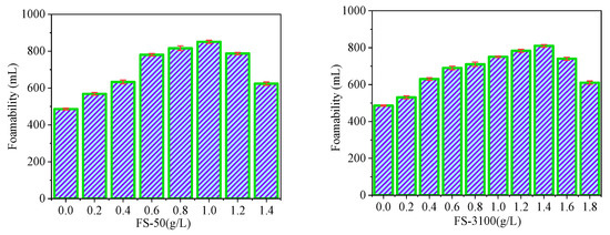 The experimental results can be summarized as follows: the addition of FS-50 and FS-3100 had a good effect on the foaming property of the soybean residue protein foaming agent (Figure 5). Specifically, when the amount of FS-50 was 1.0 g/L, the foaming rate was increased by 172.84%. However, for FS-3100, the highest foaming (810.21 mL) occurred when the addition amount was 1.4 g/L. If the addition amount exceeds these two values, the foaming property of the foam will decrease.